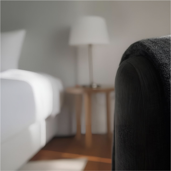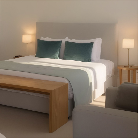 Um espaço acolhedor de tons terrosos que celebra a tranquilidade da ilha mais pequena. Ideal para fugas românticas ou estadias breves.